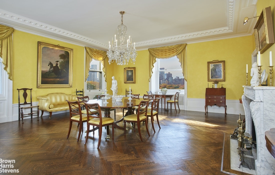 5th Ave & 74th St - Private Full Floor - 14 Rooms Distinguished full floor residence perched on the 9th floor of one of Fifth Avenue's most prestigious white-glove cooperatives. This extraordinary 14-room, 6-bedroom apartment offers grand proportions enhanced by a gracious layout spanning over 5500 square feet. This spectacular prewar apartment has 55-feet fronting Central Park and features soaring 10'6" foot ceilings, original herringbone flooring, and impressive original plaster moldings throughout. Sunlight streams in through 27 oversized windows spanning all four exposures. A private elevator landing opens into the main gallery, which has a deep coat closet and is bathed in natural light from the adjoining living room, library, and formal dining room. The gallery has a doublewide entryway that perfectly captures Central Park through the oversized living room windows. The impressive Northwest corner 33' x 18'6" living room has a wood-burning fireplace and charming views of the sailboats in the Central Park Conservatory pond. Also located off the gallery and living room is the wood-paneled North facing library complete with a wood-burning fireplace and custom built-ins. The grand formal dining room is ideally located off both the living room and gallery for seamless entertaining; this room enjoys three exposures - South, East & West capturing the Central Park South skyline, townhouse views and direct Park exposure. Conveniently next to the dining room is the windowed butler's pantry complete with a sink, dishwasher, refrigerator/freezer, linen & silver drawers, and ample storage. The sunny South-facing windowed eat-in-kitchen opens off the pantry; this room features a large double sink, a 6-burner & two griddle Garland range with two full side-by ovens underneath. Floor-to-ceiling storage and an additional refrigerator/freezer complete this spacious room. Also off the kitchen is the laundry room featuring a stacked washer/dryer, soaking sink and more storage; this room also connects back to the bedroom wing of the apartment. The private wing of the apartment is discretely located off the gallery with an elegant corridor that is perfect for hanging artwork. The North-facing luxurious 16' x 24' double master bedroom also has a wood-burning fireplace and three generous closets, one of which is a walk-in. The oversized 13'8" x 6'6" windowed marble master bathroom features a stall/shower, bidet and vanity. There are five additional bedrooms, the first of which also faces North and currently connects to the master bedroom through the master bathroom creating a master suite, but with its own en-suite bathroom and closets it can easily be converted back into a bedroom. Two additional large corner bedrooms occupy the East portion of the private wing; each of these oversized bedrooms have dual exposures that capture townhouse views over to Madison Avenue. These bedrooms also have abundant closet space and individual bathrooms. The remaining two bedrooms face South and one has oblique Park views. Five additional closets, one of which is cedar, complete this wing. 927 Fifth Avenue is one of the most exclusive addresses on Fifth Avenue. Built in 1917, this elegant 12-story limestone-clad building was designed by preeminent architects Warren & Wetmore, the main architects of Grand Central Terminal. With just one apartment per floor, residents enjoy the highest level of service and security, as well as a fitness center and storage. The sale is subject to 2.5% building transfer fee, to be paid by the purchaser. Co-Exclusive